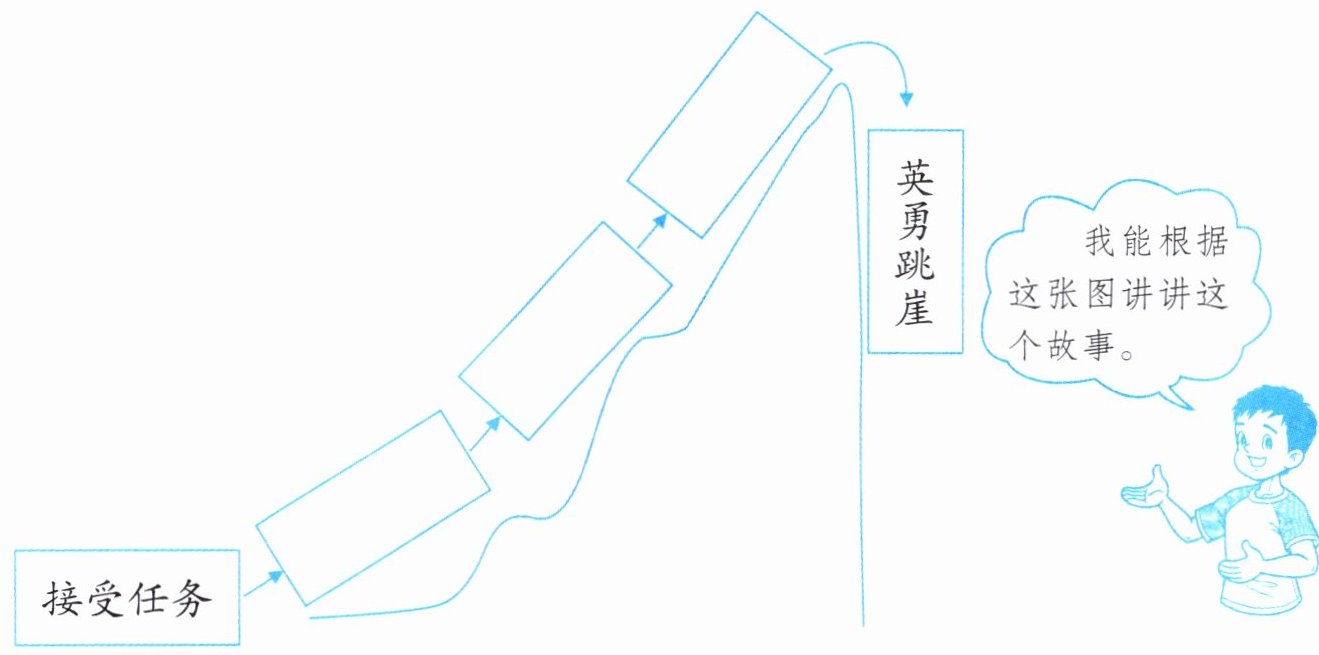 【解析】:本题主要考查对课文《狼牙山五壮士》内容的理解和概括能力,需要根据课文的情节发展,将图中空白处补充完整,并能够依据补充完整后的图讲述故事。课文讲述了抗日战争时期,五位壮士接受任务后,诱敌上山,引上绝路,峰顶歼敌,最后英勇跳崖的故事。