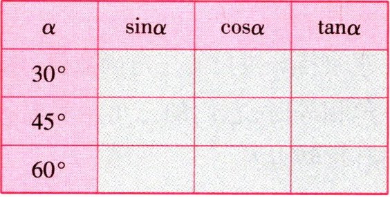 | $ \alpha $ | $ \sin \alpha $ | $ \cos \alpha $ | $ \tan \alpha $ |