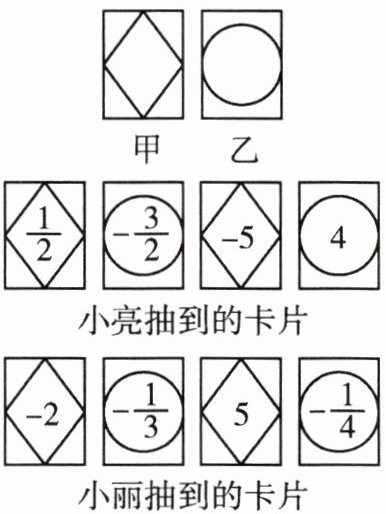 12. [2023义乌模拟]有一个游戏,规则如下:(1)每人每次抽$4$张卡片,如果抽到甲种卡片,那么加上卡片上的数字,如果抽到乙种卡片,那么减去卡片上的数字;(2)比较两人所抽到的$4$张卡片的计算数据,数据大的为胜者。小亮和小丽玩这个游戏,他们抽到的卡片如图所示,请你通过计算说明本次游戏谁获胜。