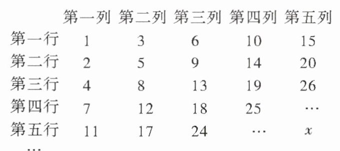 21. 如图,将连续的正整数按以下规律排列,则位于第五行第五列的数 x 是