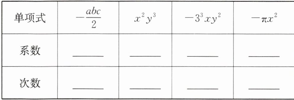 例1 指出下列各单项式的系数和次数: