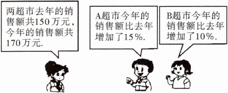 14. 七(2)班的一个综合实践活动小组去$A$、$B$两个超市调查去年和今年五一期间的销售额情况,如图是调查后小敏与其他两名同学进行交流的情景. 根据他们的对话,求$A$、$B$两个超市“五一”期间的销售额(只需列出方程即可).