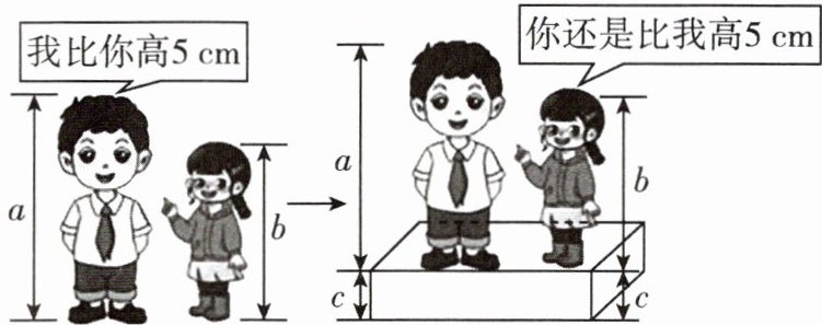 4. [2025 北京模拟]等式的性质在生活中广泛应用. 如图,$a$,$b$分别表示两名同学的身高,$c$表示台阶的高度,左边同学比右边同学高 5 cm,图中两人的对话体现的数学原理可表示为