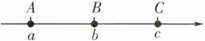 7. 如图,一条不完整的数轴上的$A$,$B$,$C$三点所表示的有理数分别为$a$,$b$,$c$,其中$AB = BC$。若$\vert a\vert>\vert c\vert>\vert b\vert$,则该数轴的原点$O$的位置应该在(