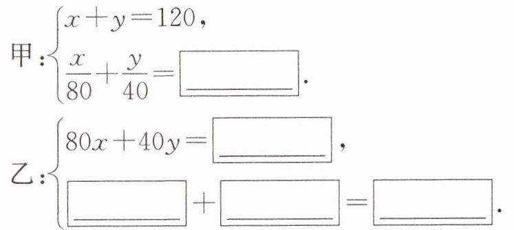 甲:$\begin{cases}x + y =$$120,\\\dfrac{x}{80} + \dfrac{y}{40} = \boxed{}\end{cases}$.