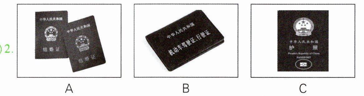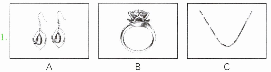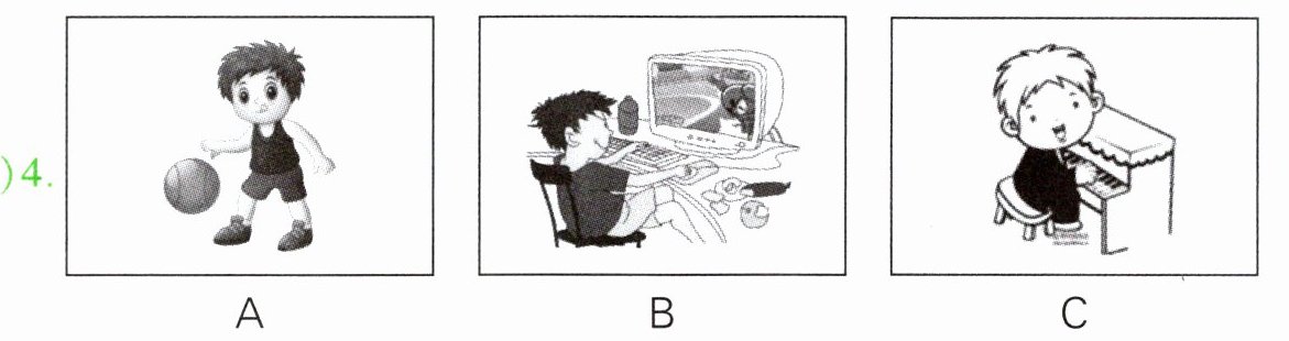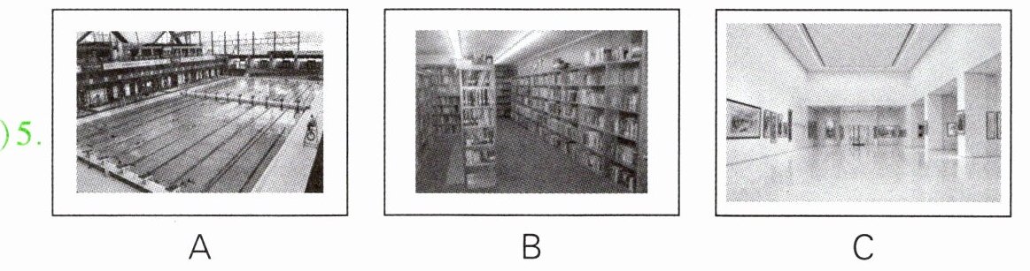 本题共有5个小题,每小题你将听到一组对话。请你从每小题所给的A、B、C三幅图片中,选出与你所听到的信息相关联的一项,并将其字母标号填入题前的括号内。