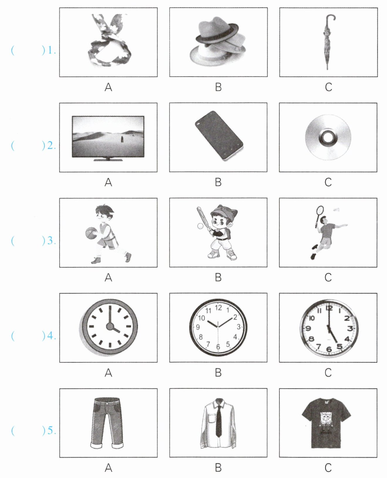 本题共有 5 个小题,每小题你将听到一组对话。请你从每小题所给的 A、B、C 三幅图片中,选出与你所听到的信息相关联的一项,并将其字母标号填入题前的括号内。