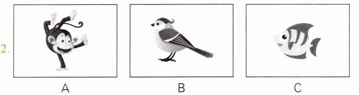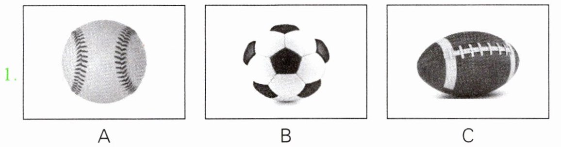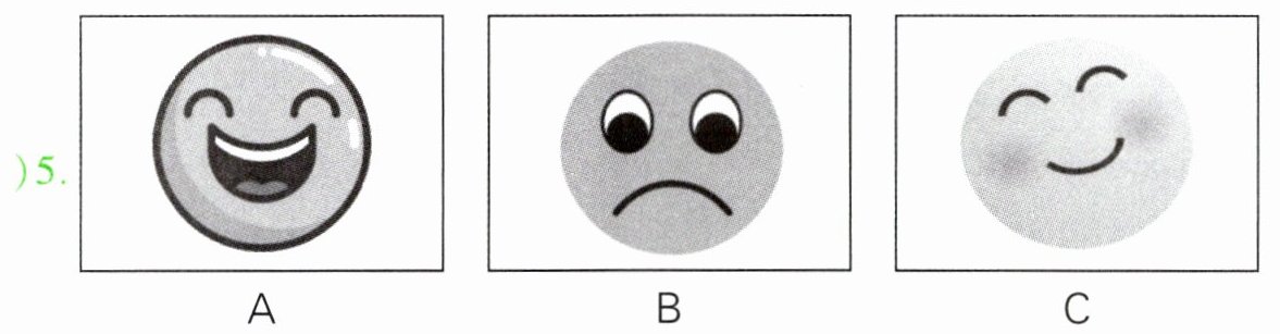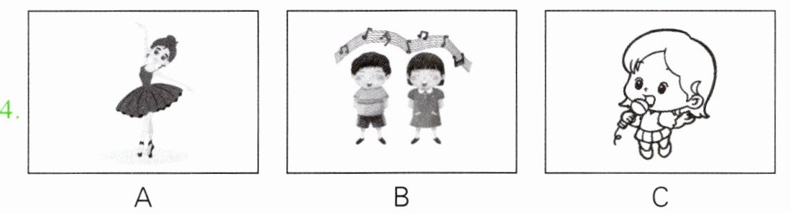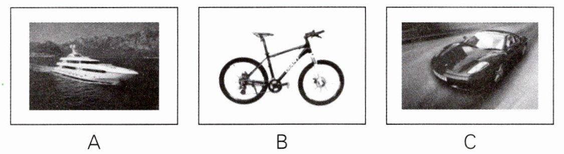本题共有5个小题,每小题你将听到一组对话。请你从每小题所给的A、B、C三幅图片中,选出与你所听到的信息相关联的一项,并将其字母标号填入题前的括号内。