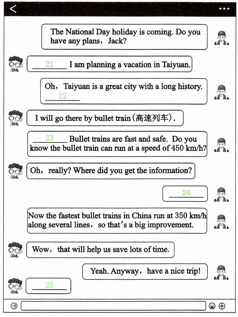 21. Yes, I do. / Of course. / Sure. 22. How will you go there? 23. Good idea. / It's a good idea. / Sounds cool. 24. From the Internet. / From a magazine. / On TV. / My mom told me about it. 25. Thank you. / Thanks.