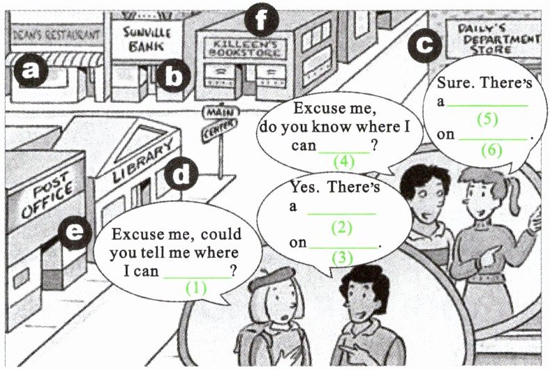 .” Tom wants to get some money from the bank. But he doesn't know how to get there. Can you guess what Tom is saying? “Excuse me, do you know where I can (4)get some money