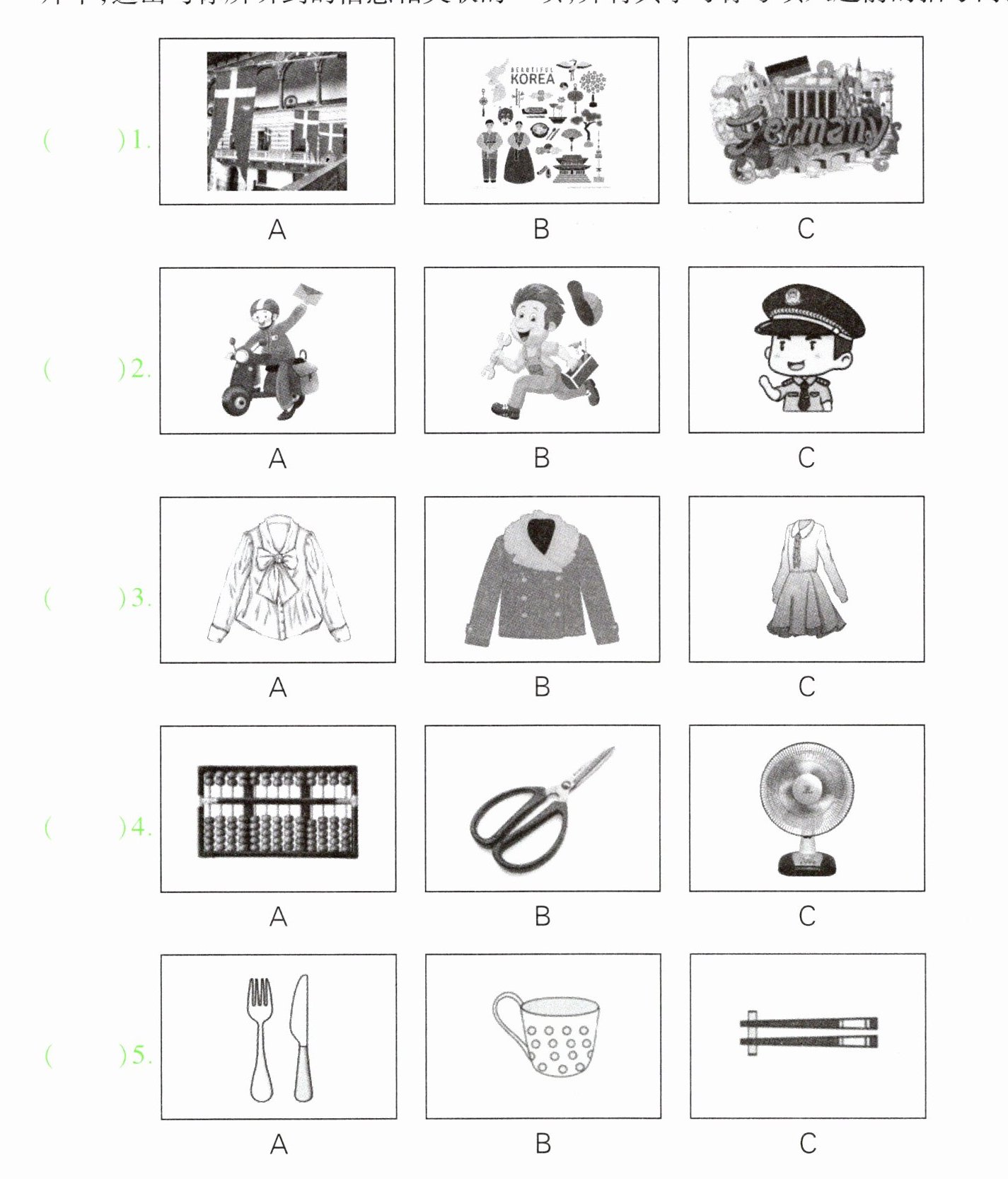 本题共有 5 个小题,每小题你将听到一组对话。请你从每小题所给的 A、B、C 三幅图片中,选出与你所听到的信息相关联的一项,并将其字母标号填入题前的括号内。