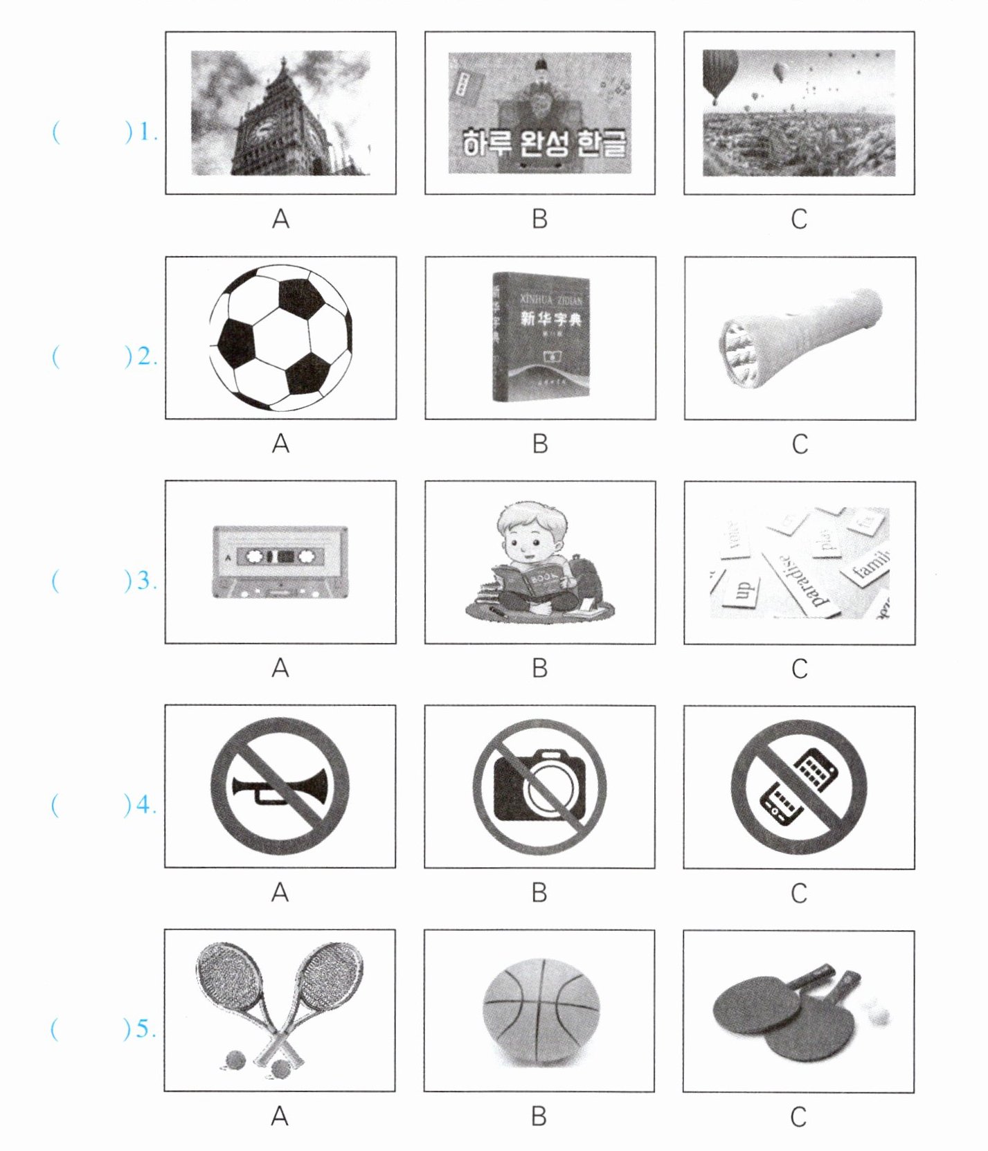 本题共有5个小题,每小题你将听到一组对话。请你从每小题所给的A、B、C三幅图片中,选出与你所听到的信息相关联的一项,并将其字母标号填入题前的括号内。