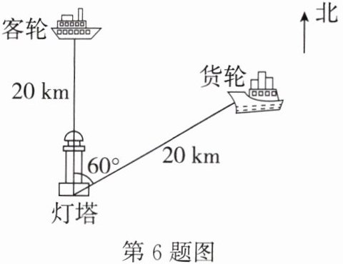 6. 如图,客轮在灯塔的正北方 $20km$ 处,货轮在灯塔北偏东 $60^{\circ}$ 的方向上,距离灯塔 $20km$ 处,则客轮与货轮的距离是