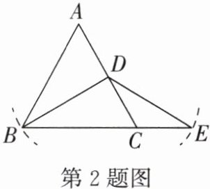 2. 【教材 P135 第 4 题改编】如图,$BD$ 是等边 $\triangle ABC$ 的边 $AC$ 上的高,以点 $D$ 为圆心,$DB$ 长为半径作弧交 $BC$ 的延长线于点 $E$,则 $\angle DEC$ 的度数为(