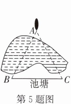 5. 如图,在一个池塘两旁有一条笔直小路($B$,$C$ 为小路端点)和一棵小树($A$ 为小树位置)。测得的相关数据为 $\angle ABC = 60^{\circ}$,$\angle ACB = 60^{\circ}$,$BC = 48m$,则 $AC$ 的长为(