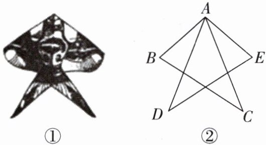 19. 【几何直观】如图①是小军制作的燕子风筝,燕子风筝的骨架图如图②所示,$AB = AE$,$AC = AD$,$\angle BAD = \angle EAC$,$\angle C = 50^{\circ}$,求$\angle D$的度数。