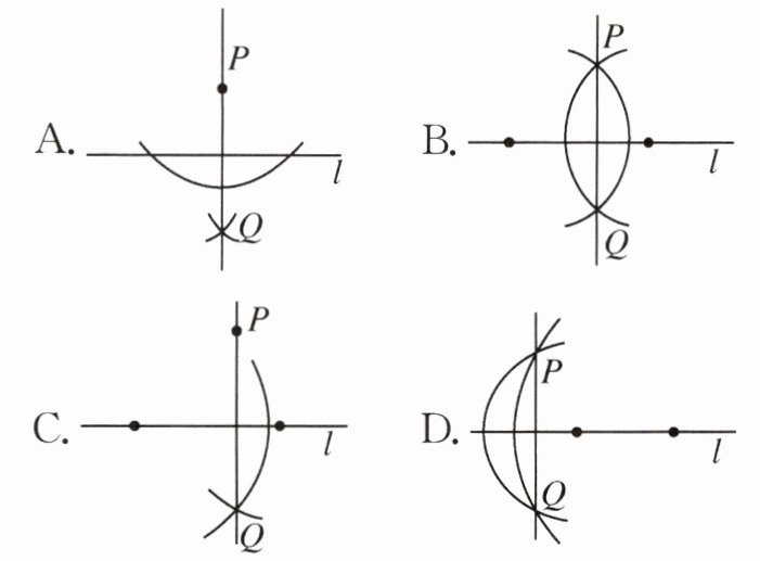 16. 过直线$l$外一点$P$作直线$l$的垂线$PQ$。下列尺规作图错误的是( )