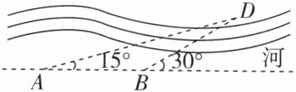 4. 【教材 P160 例 2 改编】如图,小敏在河岸的点 $A$ 测得看对岸点 $D$ 的视线与其所在河岸的直线成 $15^{\circ}$ 角,然后沿该直线行走 $100m$ 到达点 $B$,此时测得看对岸点 $D$ 的视线与前进方向成 $30^{\circ}$ 角,问河宽是多少米?