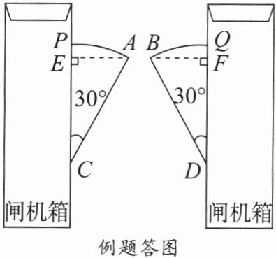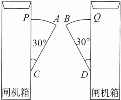 例 如图是某超市入口的双翼闸门,当它的双翼展开时,双翼边缘的端点 $A$ 与 $B$ 之间的距离为 $10cm$,双翼的边缘 $AC = BD = 54cm$,且与闸机侧立面夹角 $\angle PCA=\angle QDB = 30^{\circ}$。求当双翼收起时,可以通过闸机的物体的最大宽度。