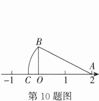 10. 【教材P167“议一议”改编】如图,数轴上的点$O$表示的数是$0$,点$A$表示的数是$2$,$OB\perp OA$,垂足为$O$,且$OB = 1$,以点$A$为圆心,$AB$长为半径画弧,交数轴于点$C$,则点$C$表示的数为(