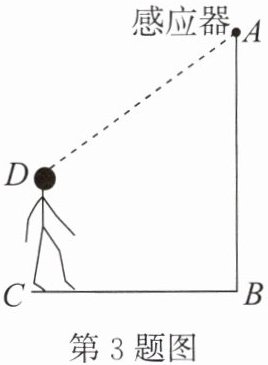 3. 如图,某自动感应门的正上方$A$处装有一个感应器,离地$AB = 2.5$m,当人体进入感应器的感应范围内时,感应门就会自动打开。一个身高$1.6$m 的学生$CD$正对门,缓慢走到离门$1.2$m 的地方时($BC = 1.2$m),感应门自动打开,则人头顶离感应器的距离$AD$为(
