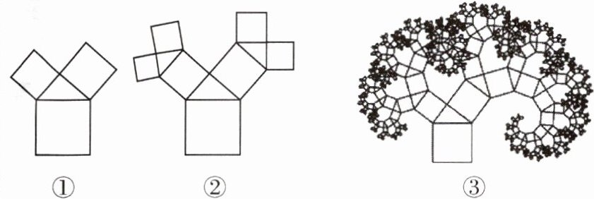变形 4 [2024 大庆]如图①,直角三角形的两个锐角分别是$40^{\circ}$和$50^{\circ}$,其三边上分别有一个正方形。执行下面的操作:由两个小正方形向外分别作锐角为$40^{\circ}$和$50^{\circ}$的直角三角形,再分别以所得到的直角三角形的直角边为边长作正方形。图②是 1 次操作后的图形,图③是重复上述步骤若干次后得到的图形,人们把它称为“毕达哥拉斯树”。若图①中的直角三角形斜边长为 2,则 10 次操作后图形中所有正方形的面积和为