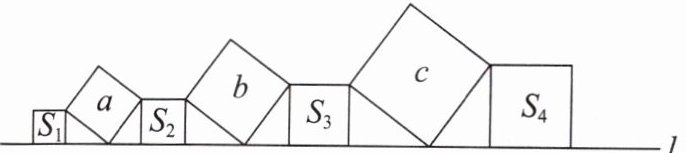 变形 6 如图,在直线$l$上依次摆放着七个正方形。已知斜放置的三个正方形的面积分别是$a$,$b$,$c$,正放置的四个正方形的面积依次是$S_{1}$,$S_{2}$,$S_{3}$,$S_{4}$,则$S_{1}+S_{2}+S_{3}+S_{4}=$