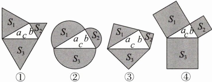 变形 1 如图①~④,以直角三角形的三条边$a$,$b$,$c$为边,向外分别作等边三角形、半圆、等腰直角三角形和正方形。上述四种情况的面积关系满足$S_{1}+S_{2}=S_{3}$的图形有(