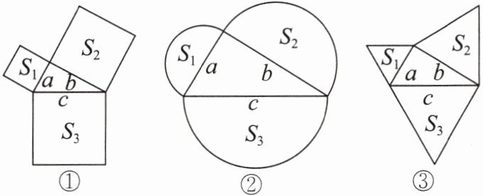 如图①,分别以直角三角形的三条边$a$,$b$,$c$为边,向外作正方形,那么$S_{1}+S_{2}=S_{3}$吗?如图②,分别以直角三角形三条边为直径向外作半圆,是否也存在$S_{1}+S_{2}=S_{3}$?如图③,如果以三条边向外作等边三角形呢?