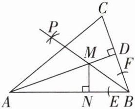 4. [2024湖南]如图,在锐角△ABC中,AD是边BC上的高,在BA,BC上分别截取线段BE,BF,使BE=BF;分别以点E,F为圆心,大于$\frac{1}{2}EF$的长为半径画弧,在∠ABC内,两弧交于点P,作射线BP,交AD于点M,过点M作MN⊥AB于点N。若MN=2,AD=4MD,则AM=