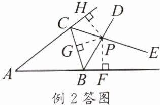 例2 如图,在△ABC中,∠ABC的外角平分线BD与∠ACB的外角平分线CE相交于点P。求证:点P在∠CAB的平分线上。