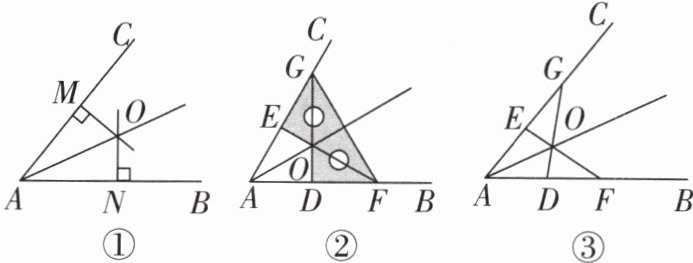 【问题拓展】小宇用直尺按下面的方法作角平分线:如图③,在∠CAB两边上,分别取AE=AD,AG=AF(点E,G不重合),连接EF,GD相交于点O,作射线AO,则AO平分∠CAB。