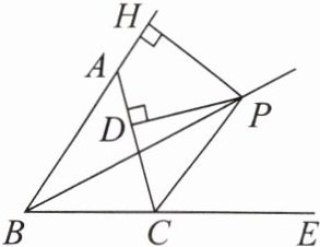 9. 如图,在△ABC中,∠ABC的平分线与△ABC的外角∠ACE的平分线相交于点P,PD⊥AC于点D,PH⊥BA,交BA的延长线于点H。