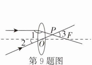 9. 【跨学科·物理】如图,一束平行于主光轴的光线经凸透镜折射后,其折射光线与一束经过光心O的光线相交于点P,点F为焦点.若∠1=155°,∠2=30°,则∠3的度数为(