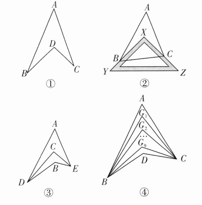 ③如图④,∠ABD,∠ACD 的十等分线相交于点 G₁,G₂,…,G₉. 若∠BDC = 140°,∠BG₁C = 77°,则∠A = _______.