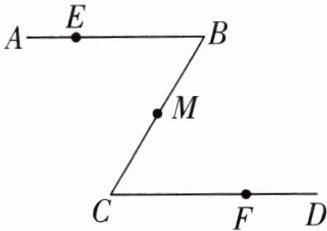 8. 如图,公园里有一条“Z”字形道路$ABCD$,其中$AB// CD$,在$AB$,$CD$,$BC$三段路上各有一个石凳$E$,$F$,$M$,且$BE = CF$,$M$是$BC$的中点,试说明三个石凳$E$,$F$,$M$在同一条直线上.(提示:通过证明$∠EMF = 180^{\circ}$来求解)