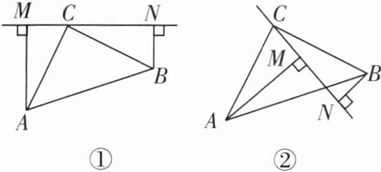 7. 【推理能力】在△ABC中,∠ACB=90°,AC=BC,过点C作直线MN,AM⊥MN于点M,BN⊥MN于点N。