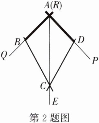 2. [2025 张家界模拟]如图,小敏做了一个角平分仪 ABCD,其中 AB = AD,BC = DC,将仪器上的点 A 与∠PRQ 的顶点 R 重合,调整 AB 和 AD,使它们分别落在角的两边上,过点 A,C 画一条射线 AE,AE 就是∠PRQ 的平分线。此角平分仪的画图原理是(