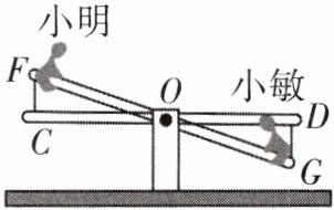 4. 如图,小明与小敏在玩跷跷板游戏,若跷跷板的支点 O(即跷跷板的中点)到地面的距离是 42 cm,当小敏从水平位置 CD 下降 16 cm 到点 G 位置时,小明在点 F 处。求小明离地面的高度。