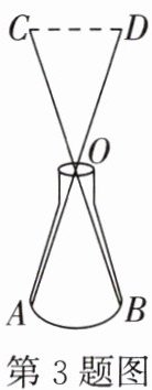 3. 【跨学科·化学】【教材 P116 例 8 改编】在数学活动课上,老师布置了“测量锥形瓶内部底面内径”的任务。小亮同学想到了以下这个方案:如图,用螺丝钉将两根小棒 AD,BC 的中点 O 固定在一起,小棒可以绕中点转动,使 CD 与瓶底平行,这样只要测得 C,D 之间的距离,就可知道内径 AB 的长度。此方案中,判定△AOB 和△DOC 是全等三角形的依据是