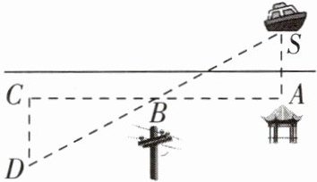 例【教材 P116“思考”改编】如图,小明站在凉亭 A 点,正对他的 S 点停有一艘游艇。他想知道这艘游艇距离他有多远,于是他沿着凉亭走到电线杆 B 旁,接着再往前走相同的距离,到达 C 点。然后他向左直行,当看到电线杆与游艇在一条直线上时停下来,此时他位于 D 点,量得 CD 的距离是 35 m。你知道在点 A 小明与游艇的距离吗?请说出他这样做的理由。