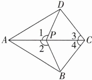 5. 如图,在四边形 $ ABCD $ 中,点 $ P $ 在对角线 $ AC $ 上,连接 $ PB $,$ PD $,$ \angle 1 = \angle 2 $,$ \angle 3 = \angle 4 $。求证:(1) $ \triangle CDP \cong \triangle CBP $;(2) $ AD = AB $。