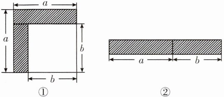 12.【几何直观,运算能力】从边长为$a$的大正方形中剪掉一个边长为$b$的小正方形(如图①),然后将剩余部分拼成一个长方形(如图②)。