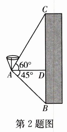 2. [2024 绥化] 如图,用热气球的探测器测一栋楼的高度,从热气球上的点 $ A $ 测得该楼顶部点 $ C $ 的仰角为 $ 60^{\circ} $,测得底部点 $ B $ 的俯角为 $ 45^{\circ} $,点 $ A $ 与楼 $ BC $ 的水平距离 $ AD = 50 $ m,则这栋楼的高度为