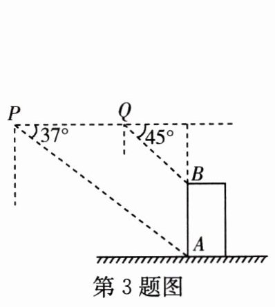 3. [2024 盐城] 如图,小明用无人机测量教学楼的高度,将无人机垂直上升距地面 $ 30 $ m 的点 $ P $ 处,测得教学楼底端点 $ A $ 的俯角为 $ 37^{\circ} $,再将无人机沿教学楼方向水平飞行 $ 26.6 $ m 至点 $ Q $ 处,测得教学楼顶端点 $ B $ 的俯角为 $ 45^{\circ} $,则教学楼 $ AB $ 的高度约为