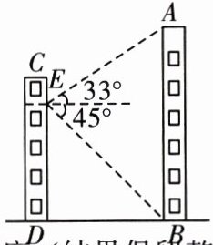 例 如图,平地上两栋建筑物 $ CD $ 和 $ AB $ 相距 $ 36 $ m,小敏在建筑物 $ CD $ 的阳台 $ E $ 处测得建筑物 $ AB $ 底部 $ B $ 的俯角为 $ 45^{\circ} $,顶部 $ A $ 的仰角为 $ 33^{\circ} $. 求建筑物 $ AB $ 的高度.(结果保留整数. 参考数据:$ \sin 33^{\circ} \approx 0.54 $,$ \cos 33^{\circ} \approx 0.84 $,$ \tan 33^{\circ} \approx 0.65 $)
