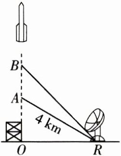 4. [2024 娄底模拟] 如图,一枚运载火箭从地面 $ O $ 处发射,当火箭到达点 $ A $ 处时. 地面 $ R $ 处的雷达站测得 $ AR $ 的距离是 $ 4 $ km,仰角为 $ 30^{\circ} $. $ 5 $ s 后,火箭直线上升到达点 $ B $ 处,此时地面 $ R $ 处的雷达站测得 $ B $ 处的仰角为 $ 45^{\circ} $. 求火箭从 $ A $ 到 $ B $ 处的平均速度(结果精确到 $ 1 $ m/s. 参考数据:$ \sqrt{3} \approx 1.732 $).