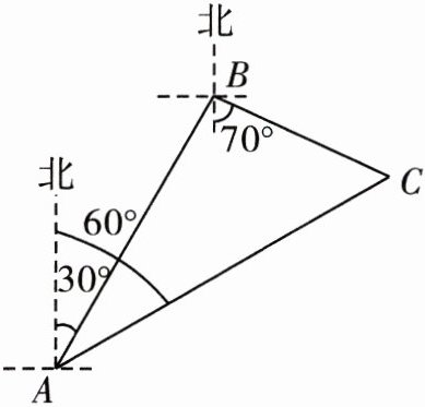 9. 如图,一艘货轮在海面上航行,准备要停靠到码头 $ C $,货轮航行到 $ A $ 处时,测得码头 $ C $ 在北偏东 $ 60° $ 方向上。为了躲避 $ A $,$ C $ 之间的暗礁,这艘货轮调整航向,沿着北偏东 $ 30° $ 方向继续航行,当它航行到 $ B $ 处后,又沿着南偏东 $ 70° $ 方向航行 $ 20 n mile $ 到达码头 $ C $。求货轮从 $ A $ 处到 $ B $ 处航行的距离。(结果精确到 $ 0.1 n mile $。参考数据:$ \sin 50° \approx 0.766 $,$ \cos 50° \approx 0.643 $,$ \tan 50° \approx 1.192 $)