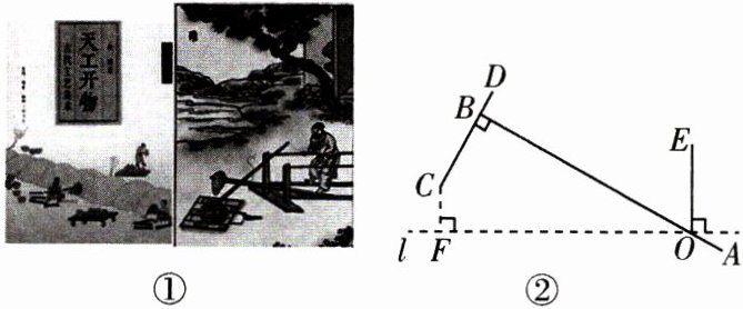 7. 【传统文化】[2024 湖南] 如图,图①为《天工开物》记载的用于舂(chōng)捣谷物的工具——“碓(duì)”的结构简图,图②为其平面示意图。已知 $ AB \perp CD $ 于点 $ B $,$ AB $ 与水平线 $ l $ 相交于点 $ O $,$ OE \perp l $。若 $ BC = 4 dm $,$ OB = 12 dm $,$ \angle BOE = 60° $,则点 $ C $ 到水平线 $ l $ 的距离 $ CF $ 为