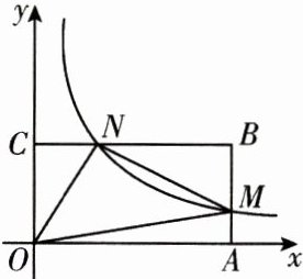 9. [2024 甘南州]如图,在平面直角坐标系中,矩形$OABC$的两边$OA$,$OC$分别在$x$轴、$y$轴的正半轴上,反比例函数$y=\frac{k}{x}$的图象与$AB$相交于点$M$,与$BC$相交于点$N$。若点$B$的坐标为$(4,2)$,$\triangle MON$的面积是$\frac{15}{4}$,则$k$的值为。